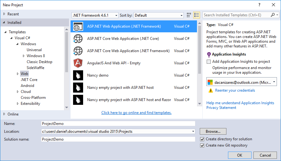 Escoger ASP.NET Web Application y ponerle un nombre al proyecto.