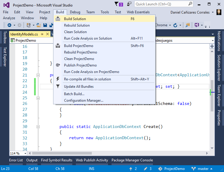 Compilamos la solución yendo al menú Build > Build Solution. Si no hay errores todo está listo para que generemos nuestros controladores y nuestras vistas (siempre se debe compilar para poder usar los generadores de código).