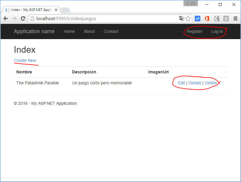 Al final tenemos una aplicación que permite crear, editar y borrar videojuegos, los datos son almacenados directamente en la base de datos (y no tuvimos que ensuciarnos las manos con sql gracias al Entity Framework) y además tenemos un sistema de autenticación de usuarios que permite registrar una cuenta e iniciar sesión. Con un poco más de configuración podemos hacer que se validen las cuentas a través de emails o mensajes de texto, inicio con cuentas de facebook, twitter, google o microsoft (entre otros proveedores de identidad).