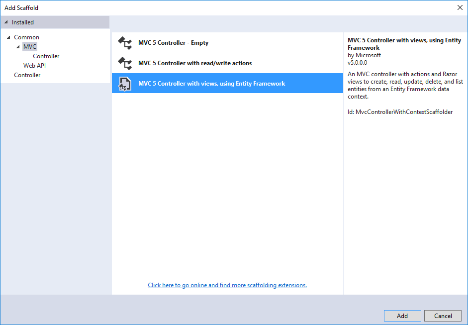 Hacer clic derecho en la carpeta Controllers y en el menú desplegable ir a Add -> Controller. En la ventana que se abre escoger la opción que dice MVC Controller with views using Entity Framework.