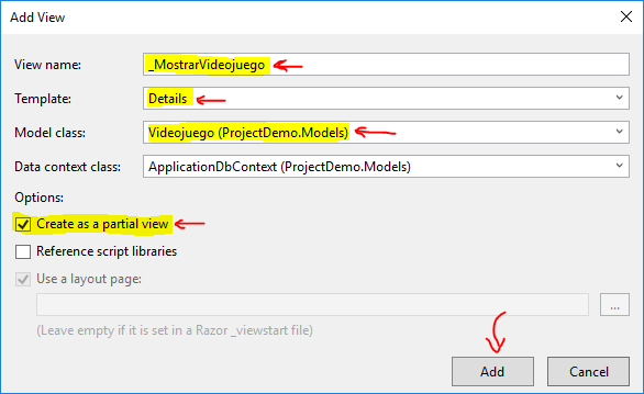 En la ventana que se abre usamos la configuración que se ve en la imagen para que Visual Studio nos genere una vista parcial llamada _MostrarTodos que tendrá una lista de videojuegos.