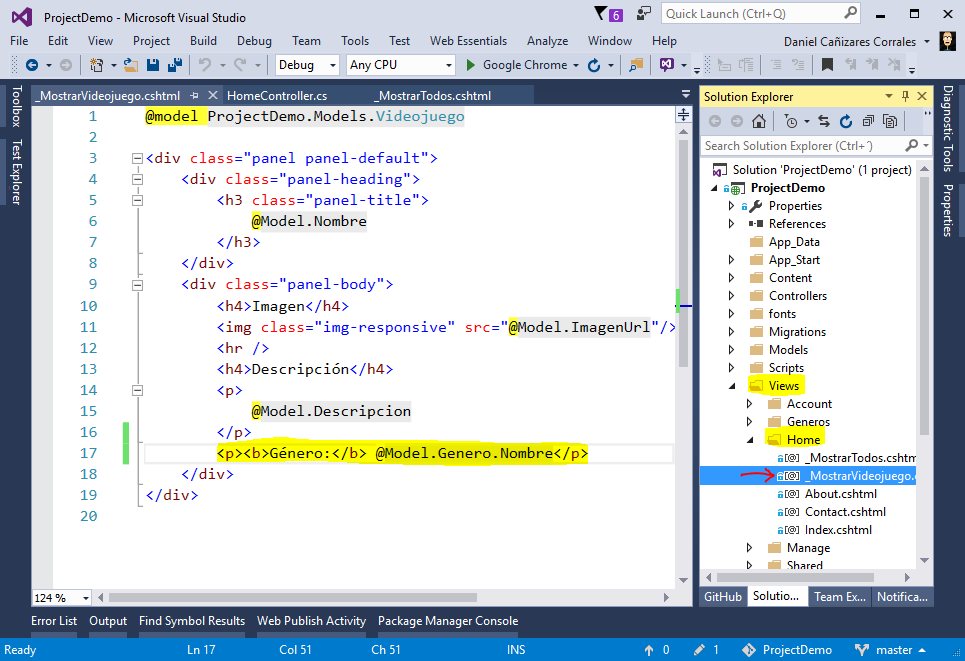 Para terminar, vamos a abrir el archivo _MostrarVideojuego.cshtml que se encuentra en la carpeta Views > Home y le vamos a añadir la línea de código que aparece resaltada en la imagen.