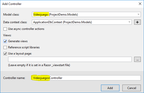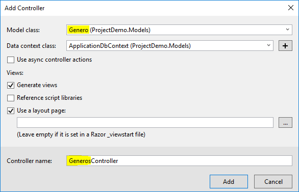 Vamos a crear el Controlador para la nueva tabla. Hacemos clic derecho en la carpeta Controllers y vamos a la opción Add > Controller... y en la ventana que se depliega escogemos la opción MVC 5 Controller with views, using Entity Framework. En la ventana que aparece seleccionamos la clase del modelo (Genero) y modificamos el nombre del controlador, como se ve en la imagen: