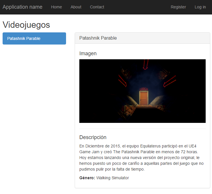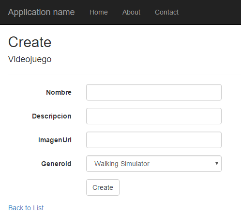 Después de esto, podemos ejecutar la aplicación e ir a localhost:####/Generos e insertar algunos datos. Luego, cuando abramos localhost:####/Videojuegos e intentemos crear un nuevo registro, debería aparecer un cuadro desplegable que permita escoger un género para el videojuego que estamos insertando.