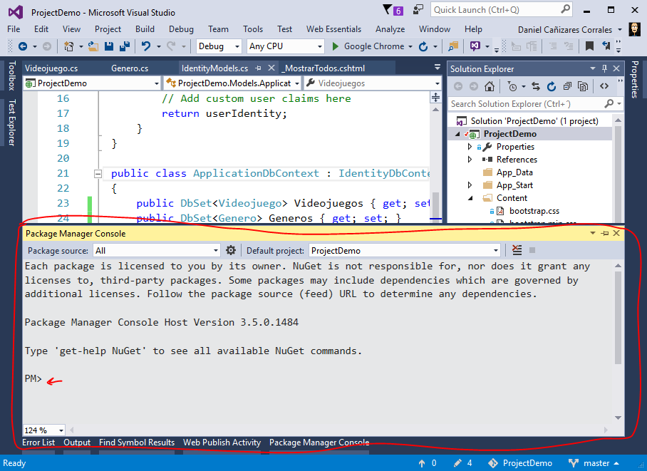 Ya que hemos añadido una clase a nuestro modelo, vamos a modificar el DbContext. Para eso, abrimos el archivo IdentityModels.cs que se encuentra en la carpeta Models, y agregamos la siguiente línea debajo de la propiedad de tipo DbSet que definimos en el capítulo 1 para los Videojuegos, así: