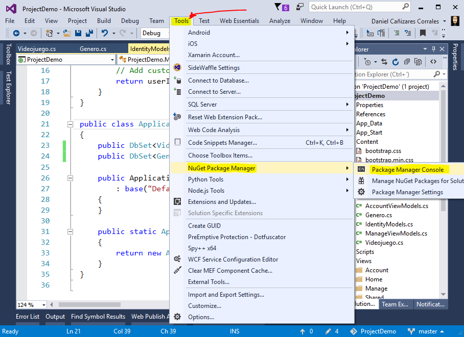 Lo primero será abrir la consola yendo al menu Tools > NuGet Package Manager > Package Manager Console, como se ve en la imagen.